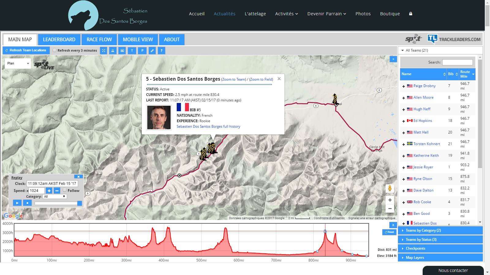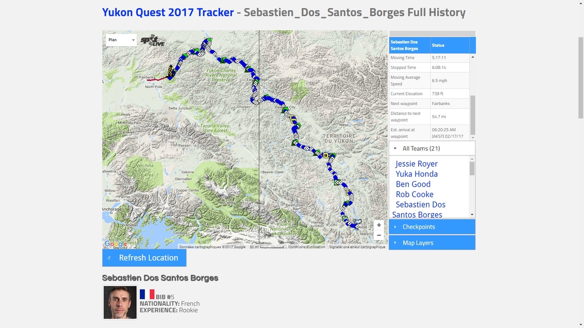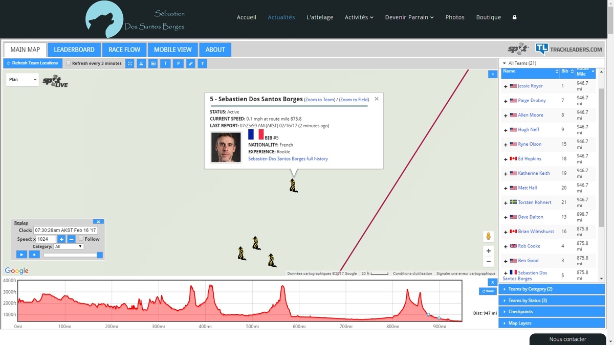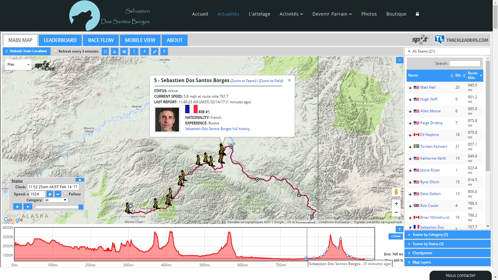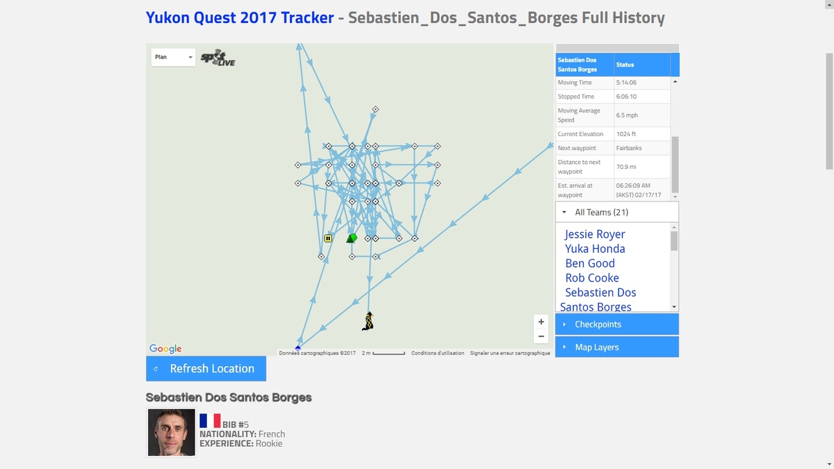 8h30 : Après 4 heures de promenade, Sébastien et la Polar Team ont retrouvé la piste. Il se rapproche donc de Fairbanks et sont à 19 miles. Rien n'est encore joué !!! Cela fait 12 heures qu'ils évoluent sur les pistes sans repos, juste quelques snacks. Sébastien voyage léger donc sans paille ni nourriture pour les chiens. Il va être très difficile de faire les 3 ou 4 heures restantes sans un arrêt mais s'arrêter sans paille et sans nourriture... Bref, vous comprendrez aisément la difficulté de ce dernier run et le stresse qui doit envahir Sébastien. Faisons confiance en la Polar Team et en Polar!!