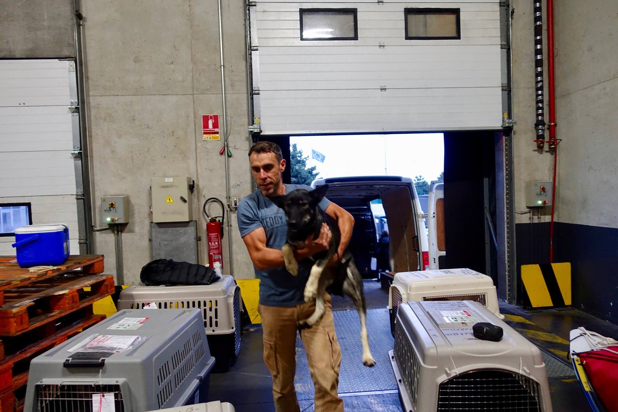 Après un peu plus d'une nuit sur la route avec ses ptits loups (comme il aime les appeler), il est arrivé à l'aéroport de Paris. Là, tout un tas d'allées et venues l'attendaient pour enregistrer chaque chien ! Imaginez vous seul, avec 14 chiens, chacun dans une caisse de transport ... Pas simple !!